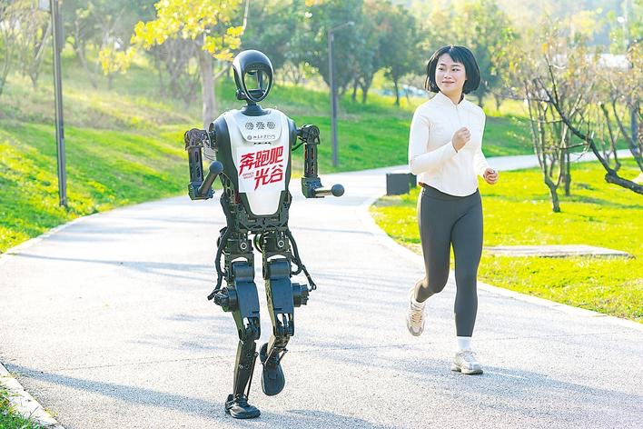 11月4日,光谷中央生態大走廊,人形機器人沿著步道奔跑,為即將舉行的光谷馬拉松預熱助威。有8臺人形機器人參與啦啦隊,它們來自5家光谷企業和高校,都已經具備高質量運動能力。 (湖北日報全媒記者 魏錸 攝)