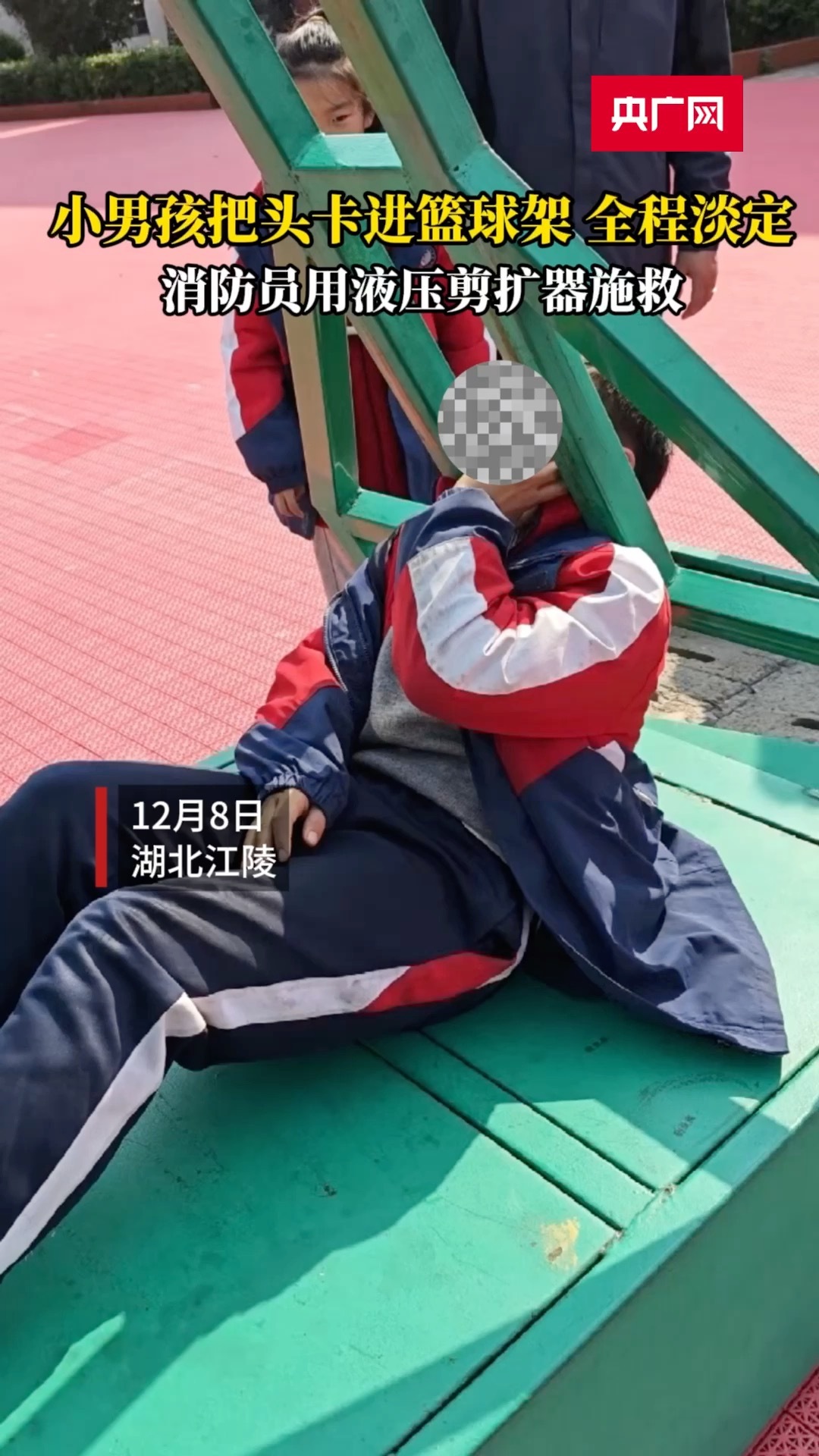 2月8日,荊州市江陵縣一名12歲的六年級學生在操場玩耍時,不慎將頭卡進籃球架,越動卡得越緊。當地消防大隊接到求救電話后,立即派出專業救援人員,借助液壓擴張剪將籃球架撐開,成功救出小男孩。