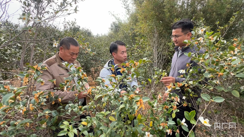 技術人員在油茶林里開展技術指導(央廣網發 陳平成 攝)