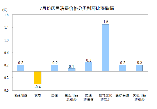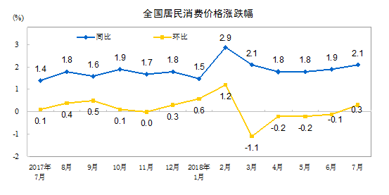 7月份,全國居民消費價格環比上漲0.3%。其中,城市上漲0.4%,農村上漲0.1%;食品價格上漲0.1%,非食品價格上漲0.3%;消費品價格上漲0.1%,服務價格上漲0.7%。