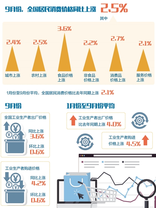 10月16日,國家統計局發布9月份全國居民消費價格指數(CPI)和工業生產者出廠價格指數(PPI)數據。數據顯示,9月份,CPI同比上漲2.5%,漲幅連續三個月處于“2時代”;PPI同比上漲3.6%,漲幅略有收窄。