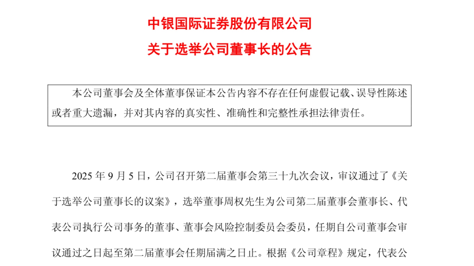 中銀證券近日發布董事長變更公告,選舉周權為董事長。