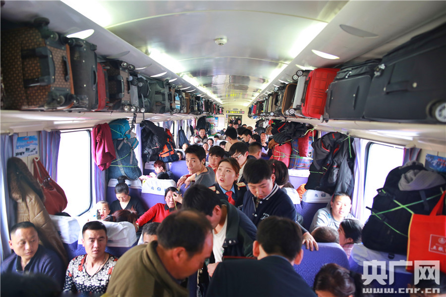 2016年3月1日廣州,廣州至烏魯木齊南的T135次列車3號硬座車廂滿載旅客,過道上站滿旅客,目測此車廂超員率超過50%。列車乘務員程春梅在車廂內檢查行李擺放情況。(張永恒攝)