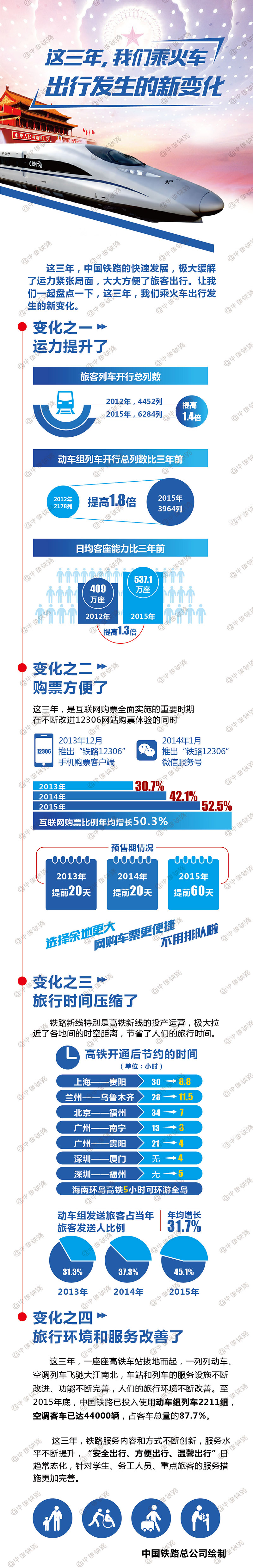 這三年,一座座高鐵車站拔地而起,一列列動車、空調列車飛馳大江南北,車站和列車的服務設施不斷改進、功能不斷完善,人們的旅行環境不斷改善。至2015年底,中國鐵路已投入使用動車組列車2211組,空調客車已達44000輛,占客車總量的87.7%。