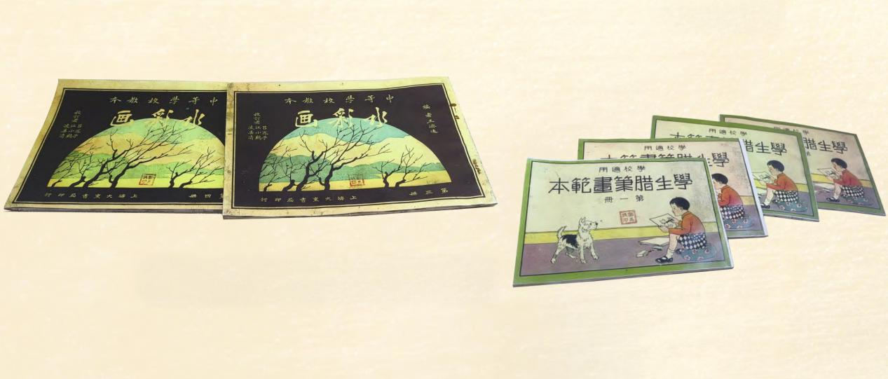 靜靜陳列著兩本早已泛黃的圖畫教材