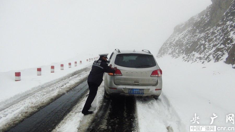 海北州祁連縣公安局交警大隊民警攜帶鐵鍬等工具迅速趕往冰溝達坂山頂。短短幾個小時,冰溝達坂山頂的積雪已有一米多深,能度不足十米。民警們到達現場后一面搜救被困群眾一面分流車輛疏導交通。民警們和被困駕駛員一起,在風雪中清雪撒沙、推車、裝防滑鏈,直到傍晚時分,所有被困車輛全部通過冰溝達坂。