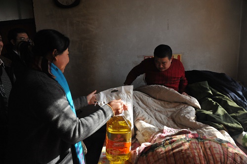 緊接著,愛心人士又馬不停蹄地來到膠西鎮最偏遠的一個村——孝源店子村,來這里探望十多戶生活困難家庭。貧困戶王清丈夫去世不久,她一個人拉扯著兩個孩子,還要照顧智障的大哥,讓在場的愛心人士深受感動。除送來的生活物品,青島君慈靈蘊心理咨詢有限公司負責人姚麗君當場掏出600元,塞到王青手里。另一位家庭生活困難的村民黃永剛,因一場車禍胳膊致殘失去了勞動能力,至今仍躺在床上,本來富裕的家庭現在“因病返貧”。愛心人士也給他送來了家庭急需的生活物品和愛心款。