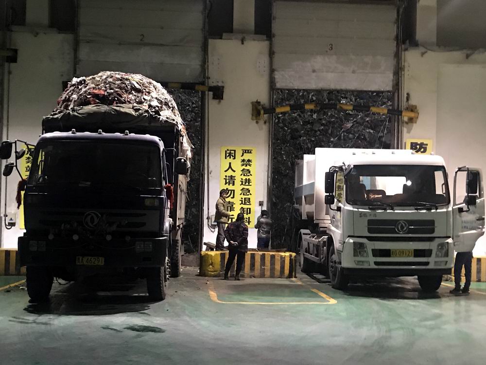 垃圾焚燒發電廠內,各地轉運來的垃圾正在投入垃圾處理投料口