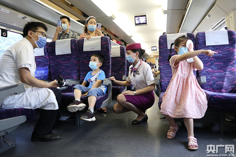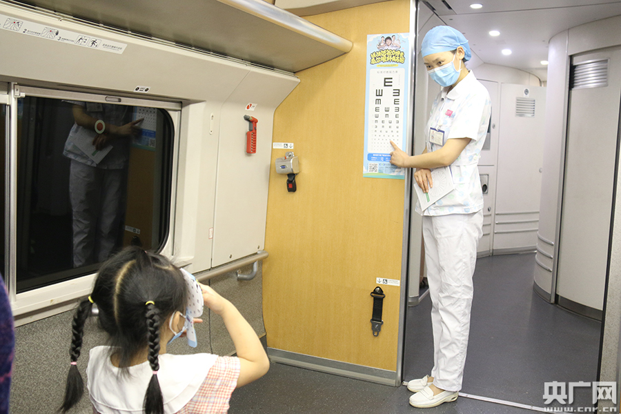 列車乘務員和醫生、護士長一起和小旅客宣傳保護眼睛的方法(央廣網發 通訊員供圖)
