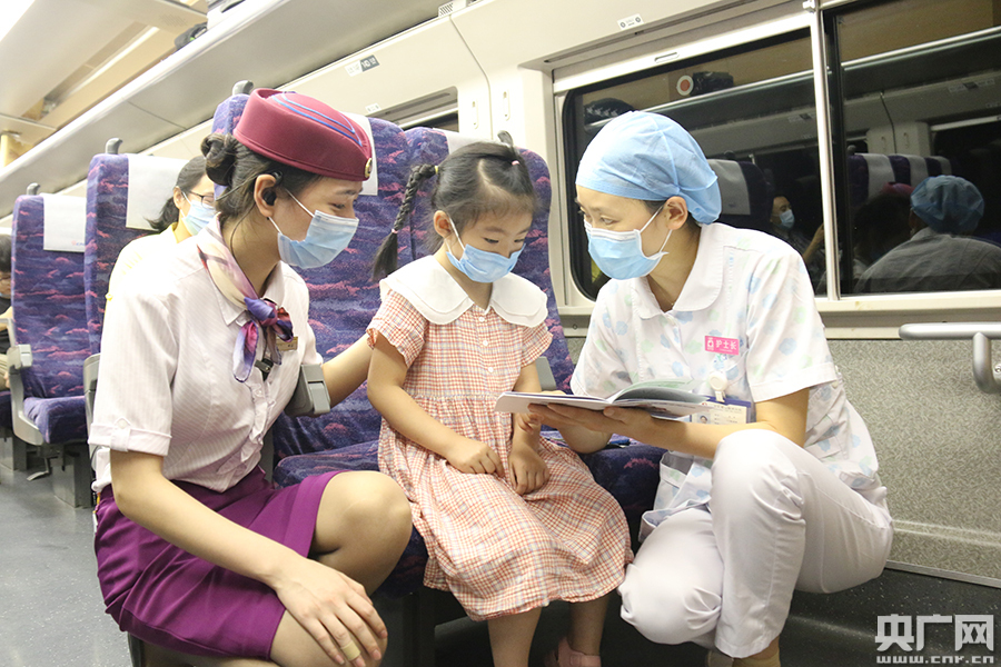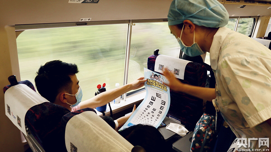 列車乘務員和護士長一起和小旅客宣傳保護眼睛的方法(央廣網發 通訊員供圖)