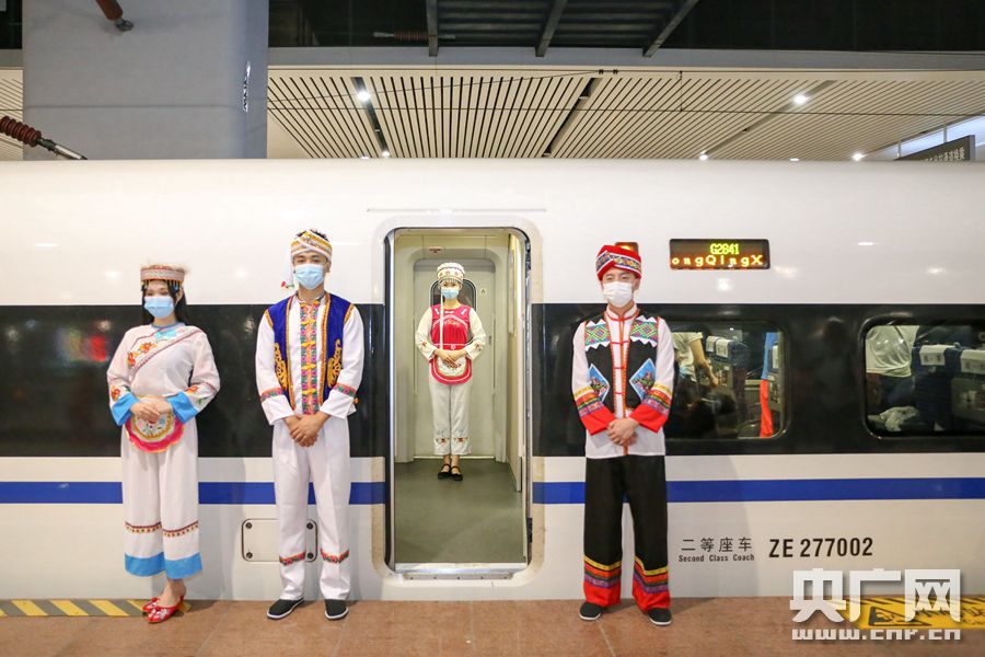 身著名族服裝的動車乘務員正迎接旅客乘車(央廣網發 通訊員供圖)