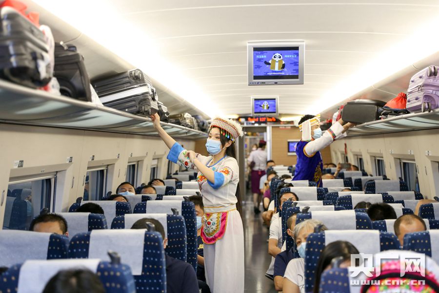 身著民族服裝的動車乘務員正在調整行李架(央廣網發 通訊員供圖)
