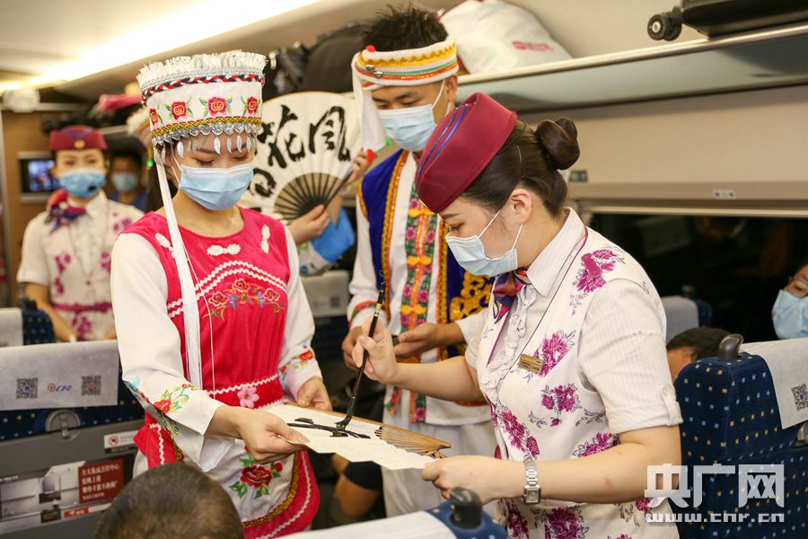 渝貴高鐵上另一位列車長秦于淼還將自己的書法才藝帶到了列車上。她在白色折扇上揮毫潑墨,書寫下風花雪月的字樣,免費送給現場的旅客,既表達對旅客們的祝福,也讓旅客們感受到高鐵拉近兩座城市的深刻涵義。