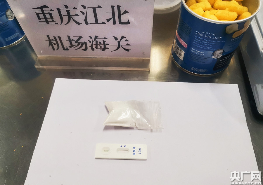 機(jī)場海關(guān)快件現(xiàn)場在餅干包裝內(nèi)查獲夾藏K粉13.5克(央廣網(wǎng)發(fā) 重慶海關(guān)供圖)