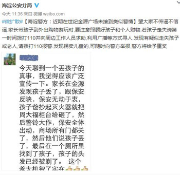 前幾日北京市民的微信群中關(guān)于“孩子被偷遭剃頭”的消息被熱傳。其內(nèi)容稱:“家長(zhǎng)在金源發(fā)現(xiàn)孩子丟了,跟保安反映,保安無(wú)動(dòng)于衷,孩子爸抄起滅火器就把某柜臺(tái)給砸了,然后警鈴大作,保安全體出動(dòng),商場(chǎng)所有門都關(guān)了,然后他們說(shuō)孩子丟了,最后在一個(gè)廁所里找到了孩子,孩子的頭發(fā)已經(jīng)被剃了。”記者電話咨詢了北京海淀區(qū)世紀(jì)金源購(gòu)物中心,但該中心稱沒有此類事情發(fā)生。4月22日北京海淀公安局分局辟謠,稱近期在世紀(jì)金源廣場(chǎng)未接到類似警情。