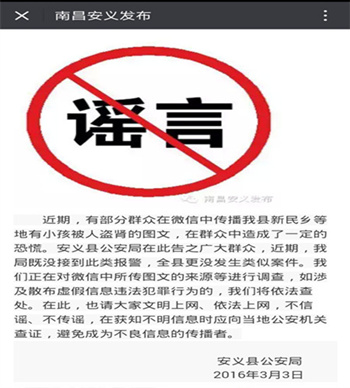 3月初,網(wǎng)傳江西省南昌市某些地區(qū)“拐小孩”并且“割腎”、“盜取器官”的相關(guān)傳言,并配有圖片。南昌公安對(duì)案件進(jìn)行了通報(bào),并將散布該謠言的嫌疑人劉某抓獲。據(jù)劉某交待,他根據(jù)網(wǎng)上一條尋人啟事,添油加醋地編了條微信,為了增加可信度,特意加上該消息從派出所獲悉的,并杜撰了派出所所長(zhǎng)的電話等等,隨后發(fā)布在微信群里和朋友圈里面。警方依據(jù)《中華人民共和國(guó)治安管理處罰法》相關(guān)規(guī)定對(duì)劉某進(jìn)行了行政拘留五日的處罰。