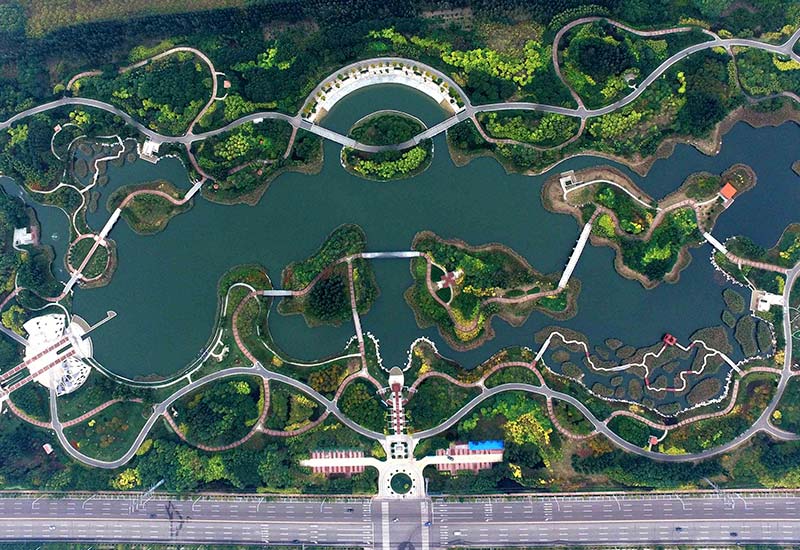 俯瞰天津濱海新區(qū)臨港經(jīng)濟區(qū)的臨港生態(tài)濕地公園(2016年10月21日攝)。