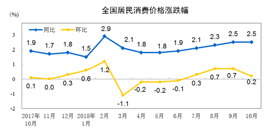 2018年10月份,全國居民消費價格同比上漲2.5%。其中,城市上漲2.5%,農村上漲2.6%;食品價格上漲3.3%,非食品價格上漲2.4%;消費品價格上漲2.8%,服務價格上漲2.1%。1-10月平均,全國居民消費價格比去年同期上漲2.1%。