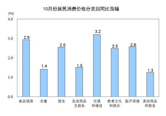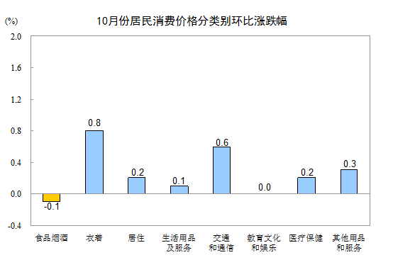10月份,全國居民消費價格環比上漲0.2%。其中,城市上漲0.2%,農村上漲0.2%;食品價格下降0.3%,非食品價格上漲0.3%;消費品價格上漲0.3%,服務價格持平。