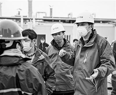 付明貴(右一)在雷神山醫院建設現場指揮調度。作者供圖