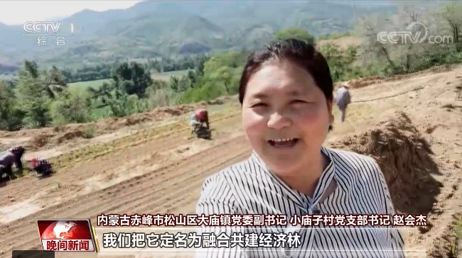 內蒙古赤峰市松山區大廟鎮黨委副書記 小廟子村黨支部書記 趙會杰:現在大家看到的是我們的大廟鎮小廟村的經濟林果樹園區,這是在今年春季我們全鎮19個行政村的黨組織和黨員干部群眾義務為我們村建起的經濟林果樹園區,我們把它定名為融合共建經濟林。