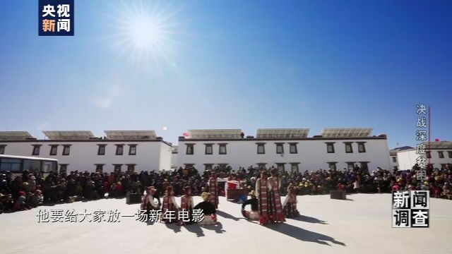 新年前的最后一天,光伏小鎮(zhèn)的廣場上有江當(dāng)鄉(xiāng)上組織的歌舞演出,全鎮(zhèn)男女老幼都跑出來曬太陽、看熱鬧。鎮(zhèn)上的電影放映員達瓦加布沒有看太久,他要去整理放映器材,如果明天風(fēng)小了,他要給大家放一場新年電影。