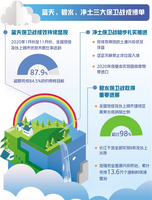 在近日召開(kāi)的國(guó)新辦新聞發(fā)布會(huì)上,生態(tài)環(huán)境部介紹,“十三五”規(guī)劃綱要確定的9項(xiàng)約束性指標(biāo)和污染防治攻堅(jiān)戰(zhàn)階段性目標(biāo)任務(wù)超額圓滿完成,藍(lán)天、碧水、凈土三大保衛(wèi)戰(zhàn)取得重要成效,生態(tài)保護(hù)和修復(fù)持續(xù)推進(jìn),應(yīng)對(duì)氣候變化工作取得積極進(jìn)展,已經(jīng)提前超額完成對(duì)外承諾的2020年目標(biāo)。