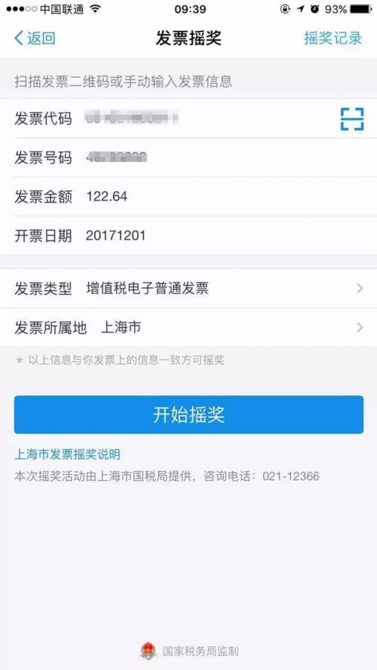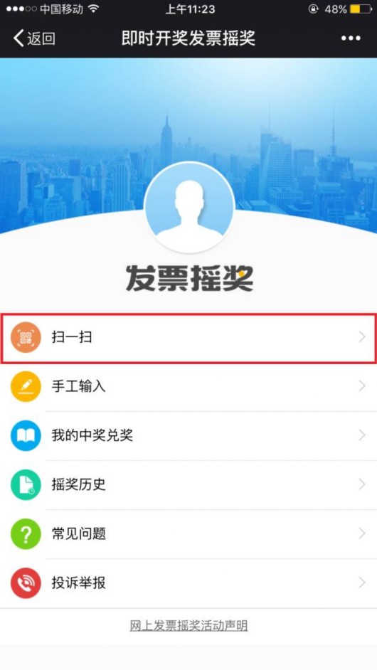 進入“發票搖獎”菜單欄,點擊“掃一掃”按鈕,掃描發票上的二維碼,符合條件的發票即可進行發票搖獎。