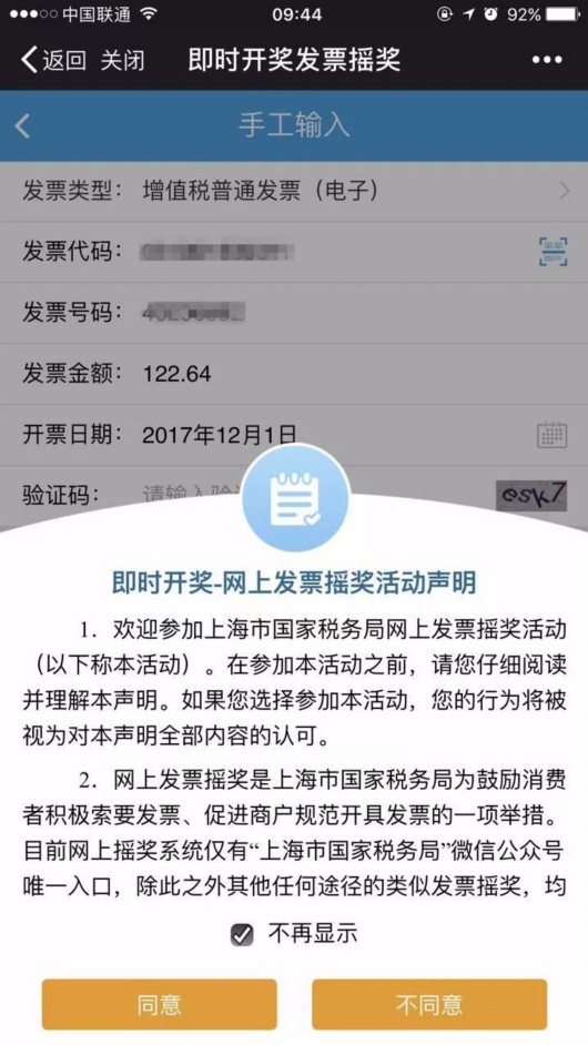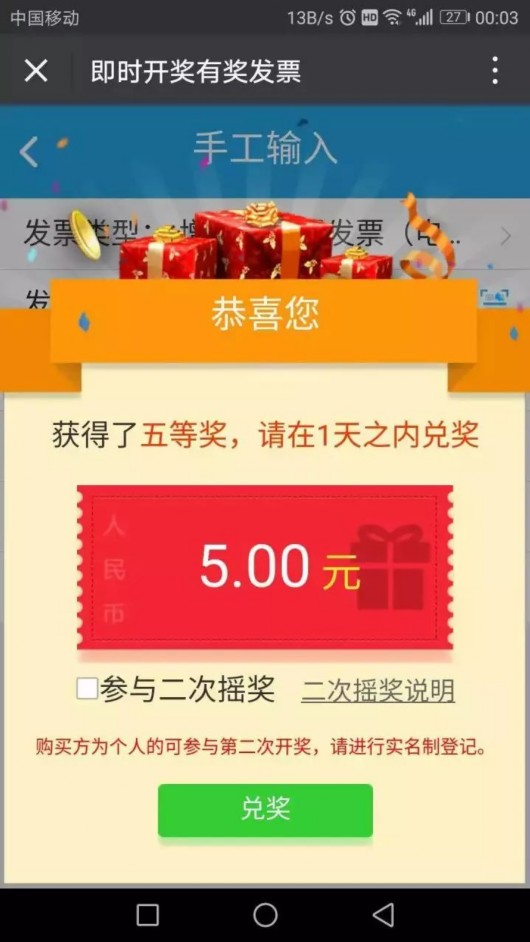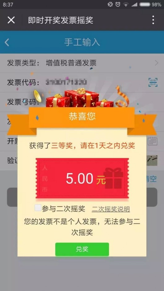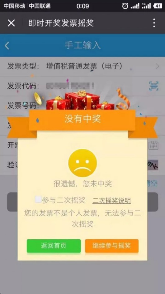如果出現以下界面,那恭喜您中獎啦!當然沒中獎的,也同樣感謝您對有獎發票試點工作的支持啦!