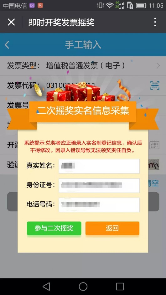 參加即開兌獎后,需根據提示信息填寫內容方能參加二次搖獎↓