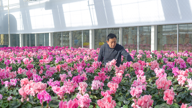 走進大棚,智能溫控系統將室內溫度恒定在作物生長適宜區間,透光頂棚與遮陽簾自動調節光照強度,水肥一體化管道精準輸送養分,2500余盆仙客來花頭飽滿、色彩鮮亮,草莓植株在暖光下盡顯生機。“大棚內的光照、二氧化碳濃度及土壤溫濕度都能精準把控。” 負責人宋玉紅介紹,這套智能設施可根據不同作物生長規律定制培育方案,不僅能延長花卉花期,還能讓草莓提前上市。