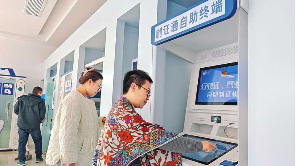 12月9日,在位于臨汾市新百匯商圈的臨汾市交警支隊智能自助車管所內(nèi),市民正在辦理駕駛證自助換領業(yè)務。自從該支隊在轄區(qū)商圈設置24小時智能自助車管所,極大地方便了群眾辦理交管業(yè)務。(閆銳鵬攝)
