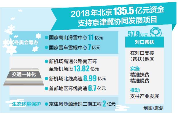 建設(shè)京張城際鐵路、首都地區(qū)環(huán)線高速,治理京津風(fēng)沙源、綠化太行山……記者昨日從北京市財政局獲悉,2018年,北京將向京津冀協(xié)同發(fā)展項目注入資金135.5億元。