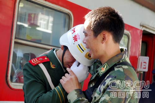 “送戰友,踏征程,默默無語兩眼淚……”25日早上10時,廈門火車站的站臺上,武警戰士們的哭聲和祝福聲交織在一起。四名即將踏上征程的老兵,默默地相擁哭泣,其他人靜靜地看著,不忍打擾他們剩下不多的相聚時間。
