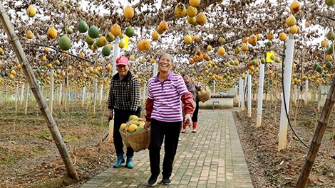 連綿起伏的藤架下,掛滿了金燦燦、綠油油、沉甸甸的瓜蔞果實。