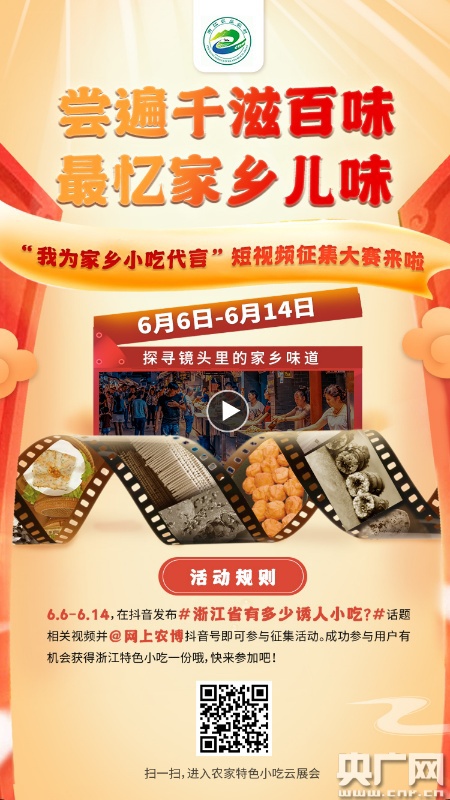 此外,在6月6-14日期間,拍攝展現家鄉小吃內容,發布于抖音并@『網上農博』抖音號,即可參加“我為家鄉小吃代言”短視頻征集活動,成功參與客戶有機會獲得浙江農家特色小吃1份。