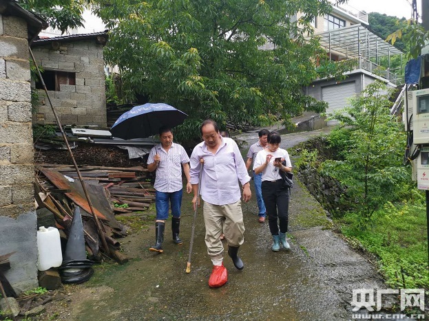 在臨岐鎮審嶺腳村,“拐杖書記”魯普恒也忙個不停。前不久,魯普恒自家造新房時不幸右腳骨折,但是防汛工作一點都沒耽誤。7日凌晨三點,審鋒自然村村民童衛國屋后塌方,魯書記接到消息,第一時間組織村干部、黨員、網格員和村民趕往童衛國家中,迅速騰空房屋,安排人員轉移,拉起警戒線,并與鎮分管領導匯報,聯系縣規劃和自然資源局前來實施地質勘查!拔覀兌紕袼诩倚菹,可他就是坐不住!贝蠹叶歼@樣說。這幾天,魯普恒每天清晨四點多就起床,一邊安排村巡防、值班人員,一邊拄著拐杖在村里查看村危房、地質災害點、河堤。幾天時間里,這位“拐杖書記”已走訪農戶260余戶,每天步數上萬計。