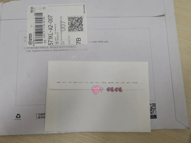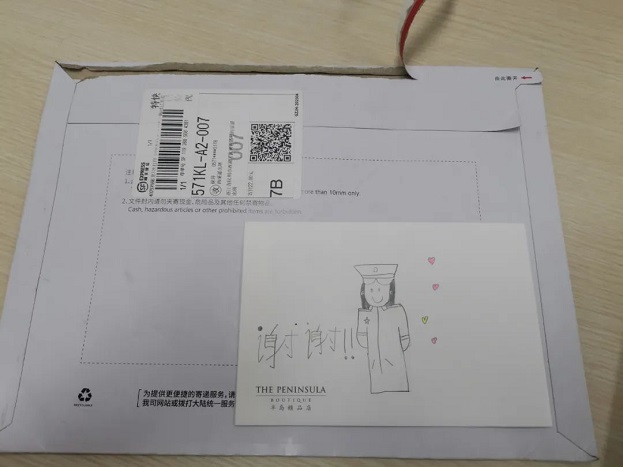 拆開快遞封條,像是一封信。封面畫了一個可愛的警察姐姐,一旁手寫兩個字:謝謝,封口還畫了一個愛心。應該是個孩子畫的,還蠻用心。