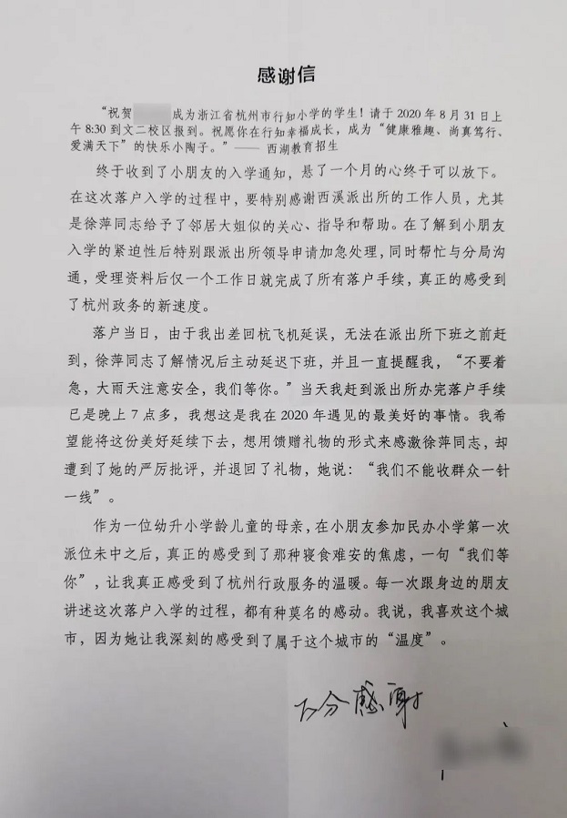 打開信封,這下大家都懂了,原來是杭州一對母女專程寫給派出所戶籍輔警徐萍的信,感謝她“創造奇跡”。