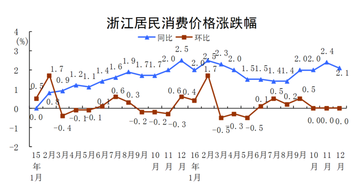 同時,12月份其他用品和服務、醫療保健、教育文化和娛樂、衣著、居住、交通和通信、生活用品及服務價格等其他七大類價格分別上漲2.9%、2.3%、2.2%、2.1%、2.0%、1.2%、0.2%。