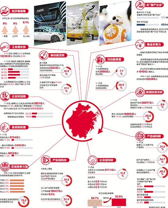 今年以來(lái),浙江堅(jiān)持穩(wěn)中求進(jìn)工作總基調(diào),以推進(jìn)供給側(cè)結(jié)構(gòu)性改革為主線(xiàn),堅(jiān)定不移打好轉(zhuǎn)型升級(jí)組合拳,全省經(jīng)濟(jì)延續(xù)了穩(wěn)走向好、質(zhì)量向優(yōu)的態(tài)勢(shì),主要經(jīng)濟(jì)指標(biāo)好于預(yù)期、好于全國(guó)。