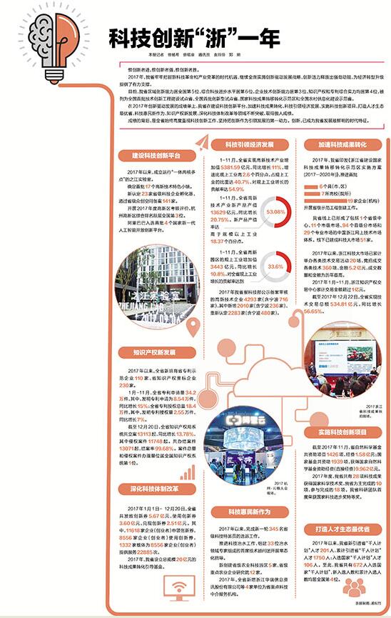 在2017年創(chuàng)新驅(qū)動(dòng)發(fā)展的成績(jī)單上,浙江在建設(shè)科技創(chuàng)新平臺(tái)、加速科技成果轉(zhuǎn)化、科技引領(lǐng)經(jīng)濟(jì)發(fā)展、實(shí)施科技創(chuàng)新項(xiàng)目、打造人才生態(tài)最優(yōu)省、科技惠民新作為、知識(shí)產(chǎn)權(quán)新發(fā)展、深化科技體制改革等領(lǐng)域不斷突破,取得傲人成績(jī)。